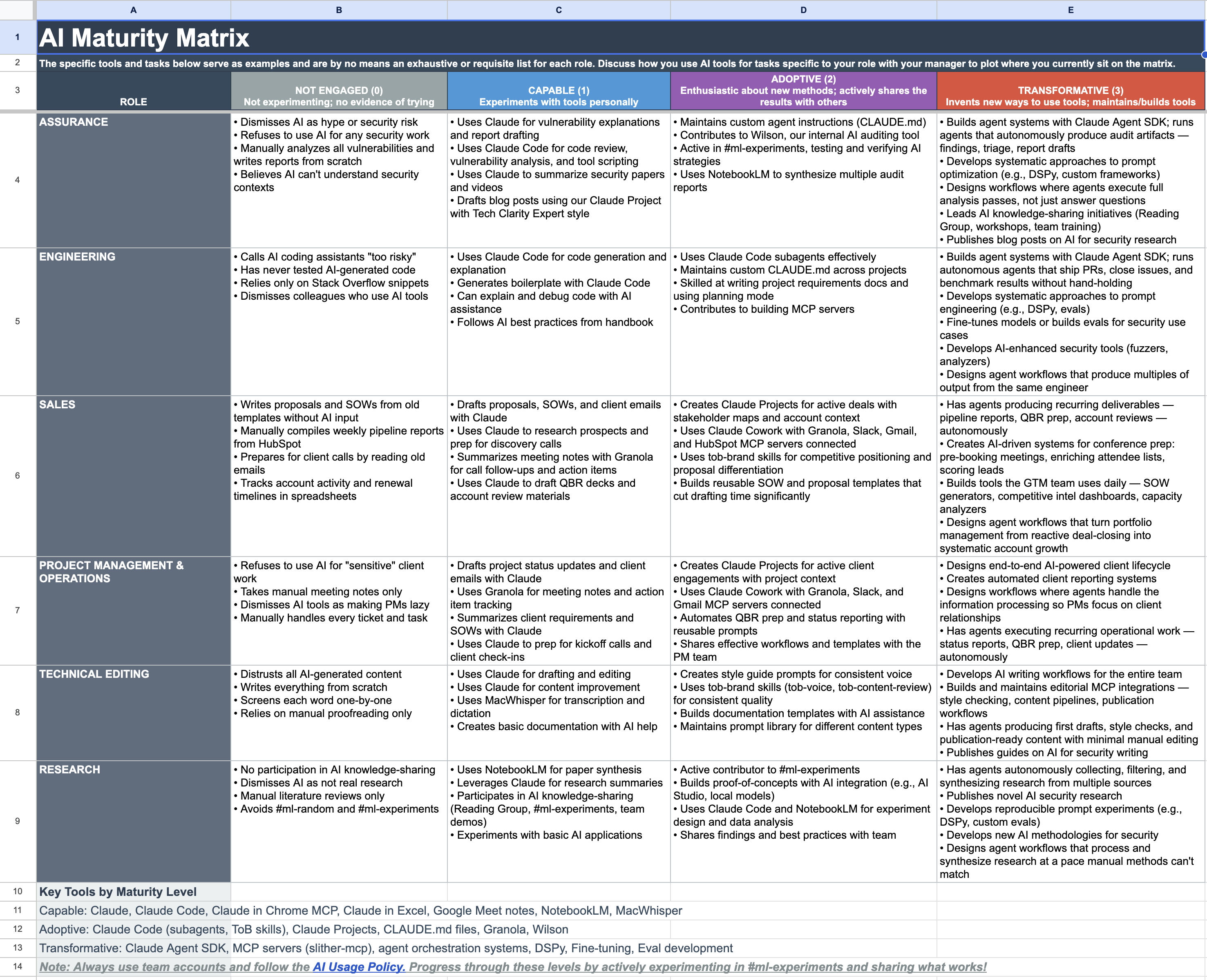 We built an AI Maturity Matrix that makes AI usage a first-class professional capability, like "can you use Git" or "can you write tests."