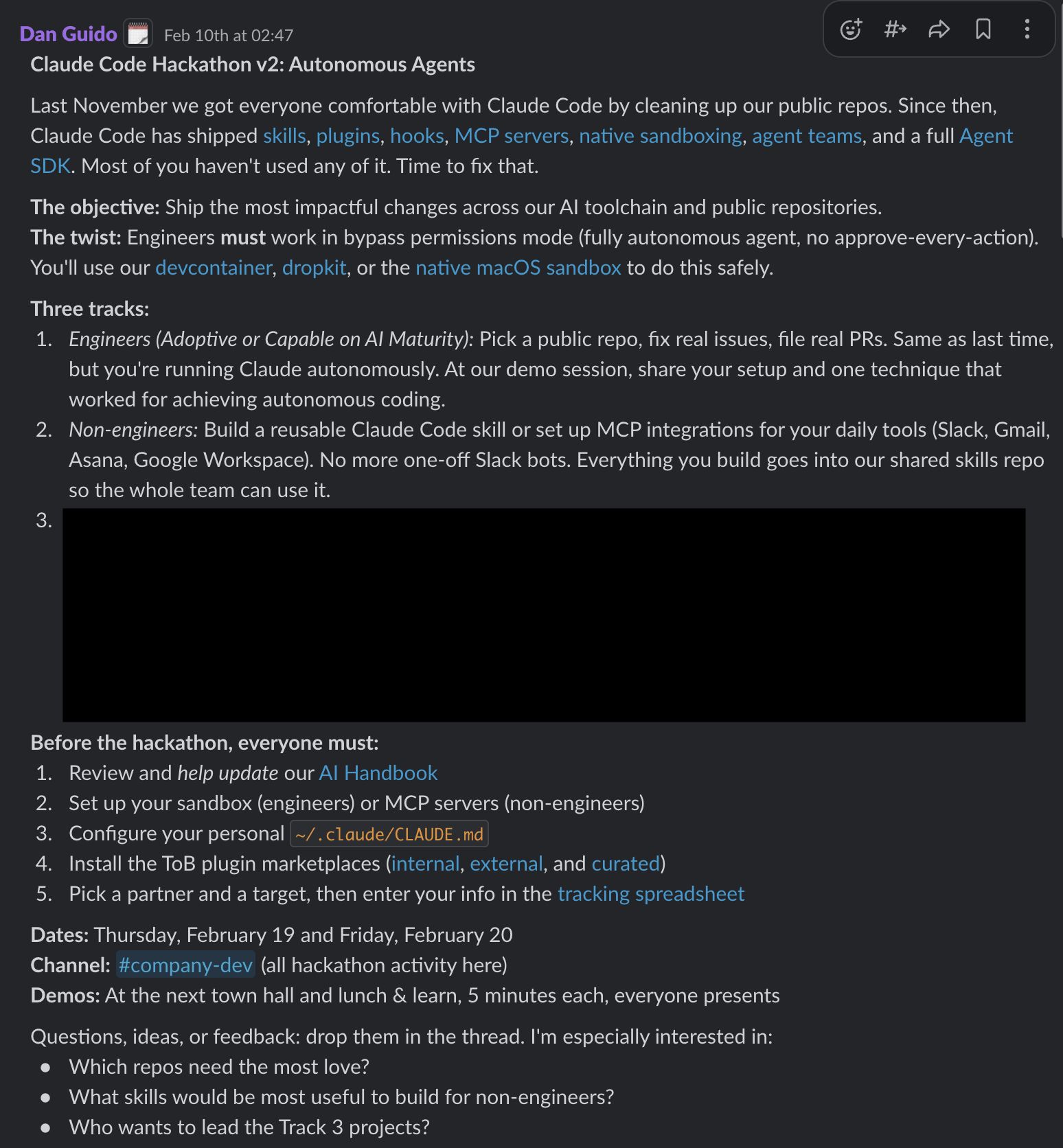 One recent example: "Claude Code Hackathon v2: Autonomous Agents." The two lines that mattered were: