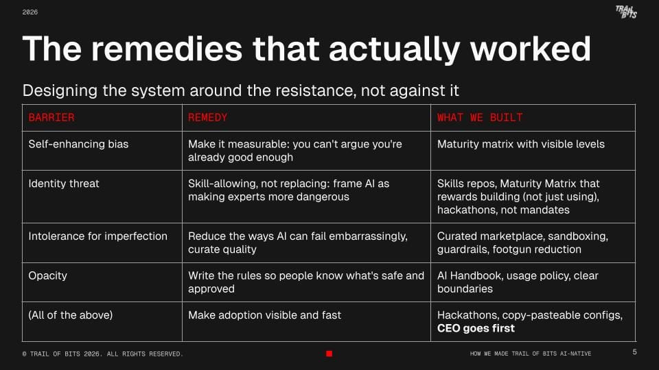 When I first launched this initiative inside Trail of Bits, there was an incredible amount of pushback. Studies of technology adoption consistently show the same thing: the problem is never the software. It's people's unwillingness to accept that something else might be better than their intuition. I had to understand four specific psychological barriers before I could design a system that works within them.